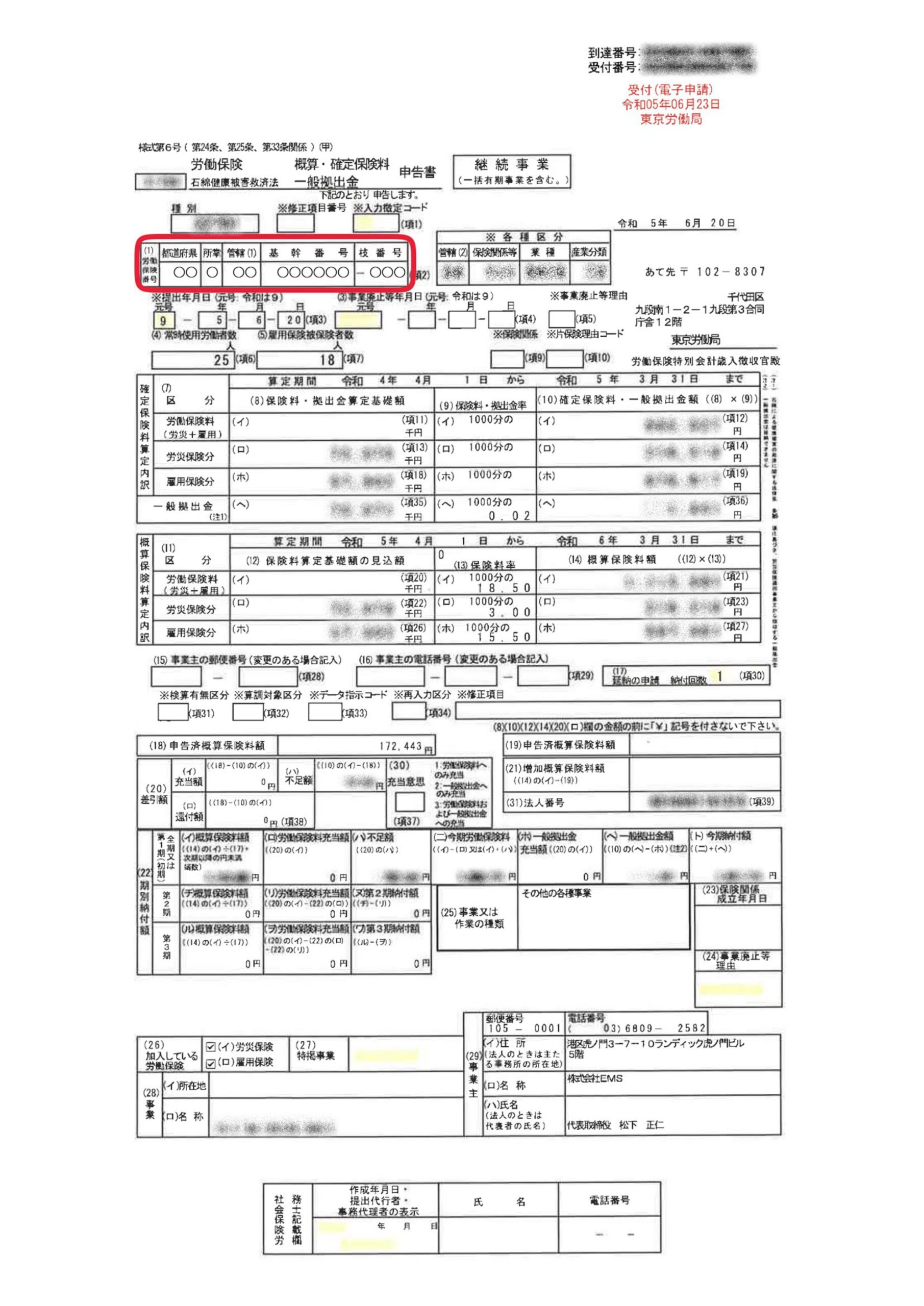 | 管轄 (2桁) | 会社の所在地を管轄する「労働基準監督署」か「公共職業安定所」の番号 |