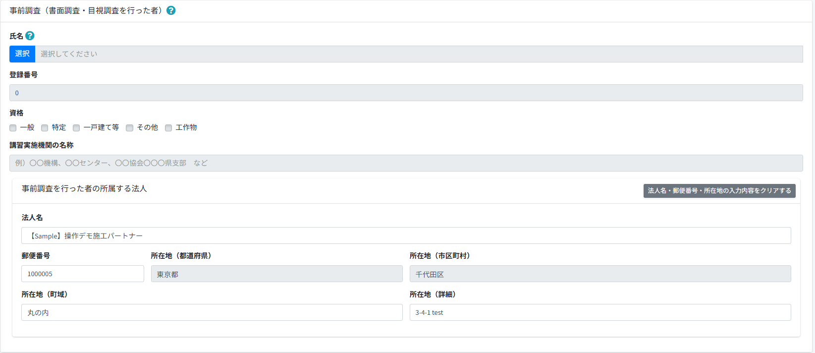 - [石綿有資格者種別]に[建築物石綿含有建材調査者]を選択します。