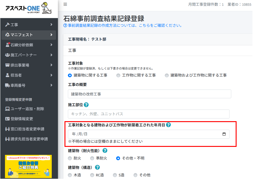 工事登録完了後、[工事一覧]の[詳細]に進みます。その後[石綿]から[石綿業務一覧]の[事前調査結果記録]から登録してください。