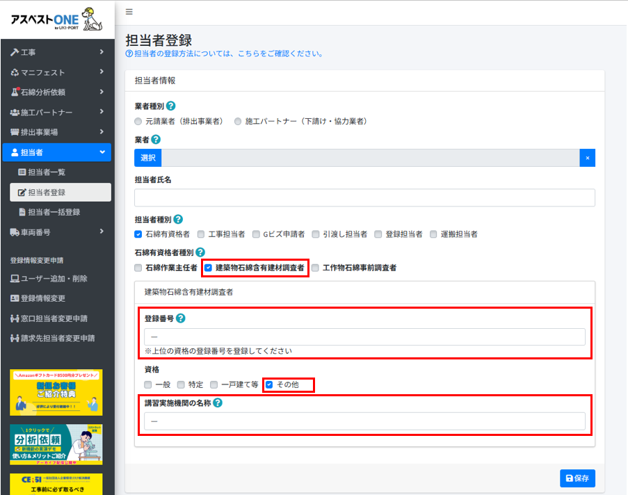 - [担当者種別]に[石綿有資格者]を選択します。