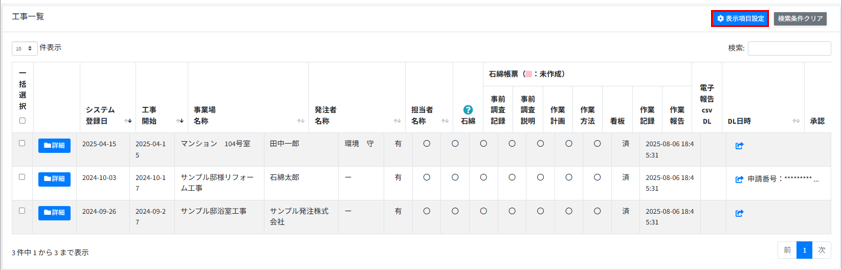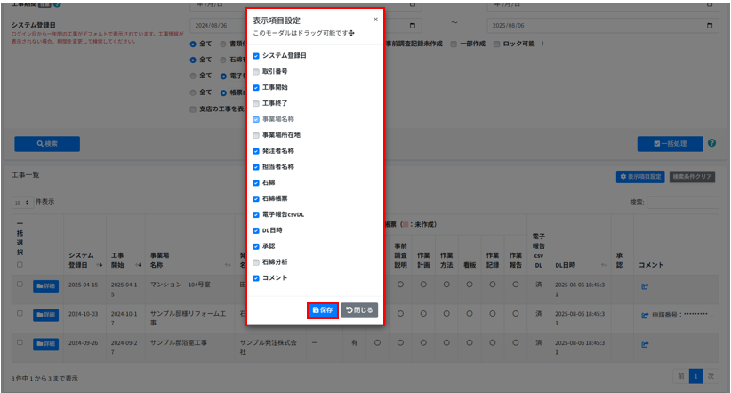 [表示項目設定]のチェック✓を入力し、反映したい項目を選択し[保存]を押してください。