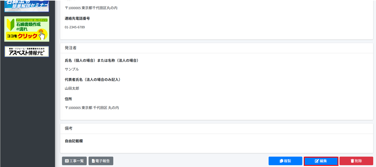 [工事登録]に登録誤りがあった場合は、[工事一覧]の[編集]で修正してください。
