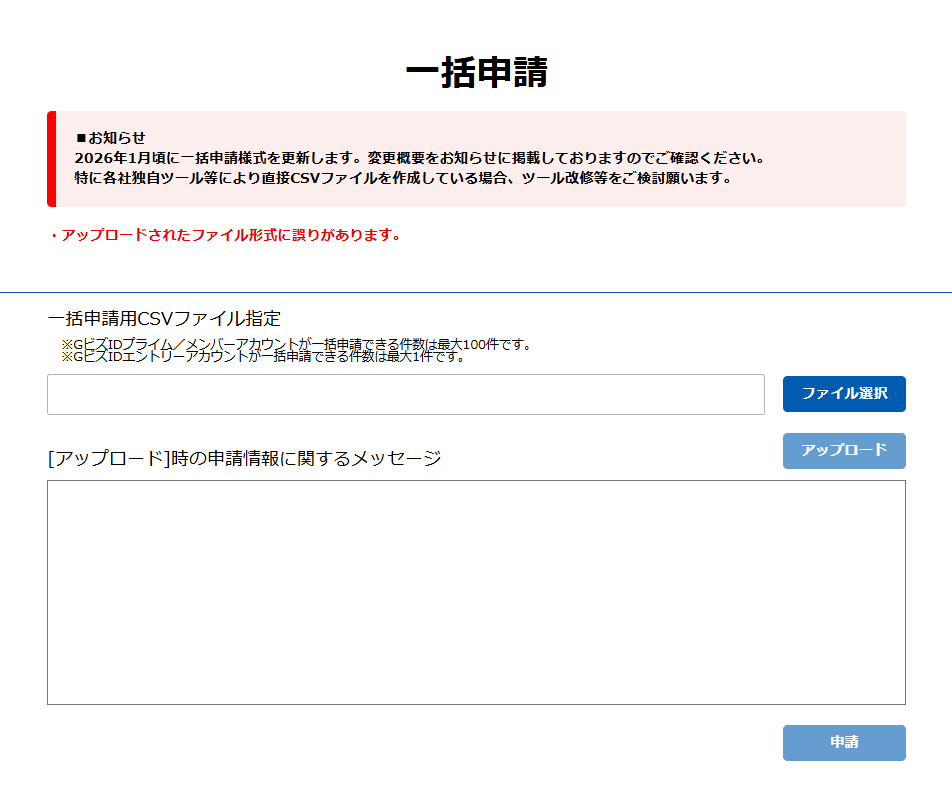 申請を行うと[アップロードされたファイル形式に誤りがあります。]とのエラーメッセージが表示されます。