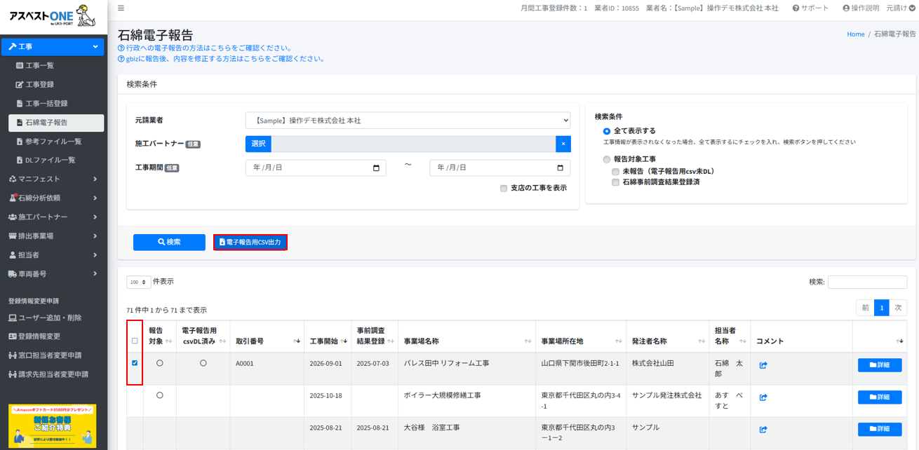 [石綿電子報告]より、☑を入れて[電子報告用CSV出力]を押します。