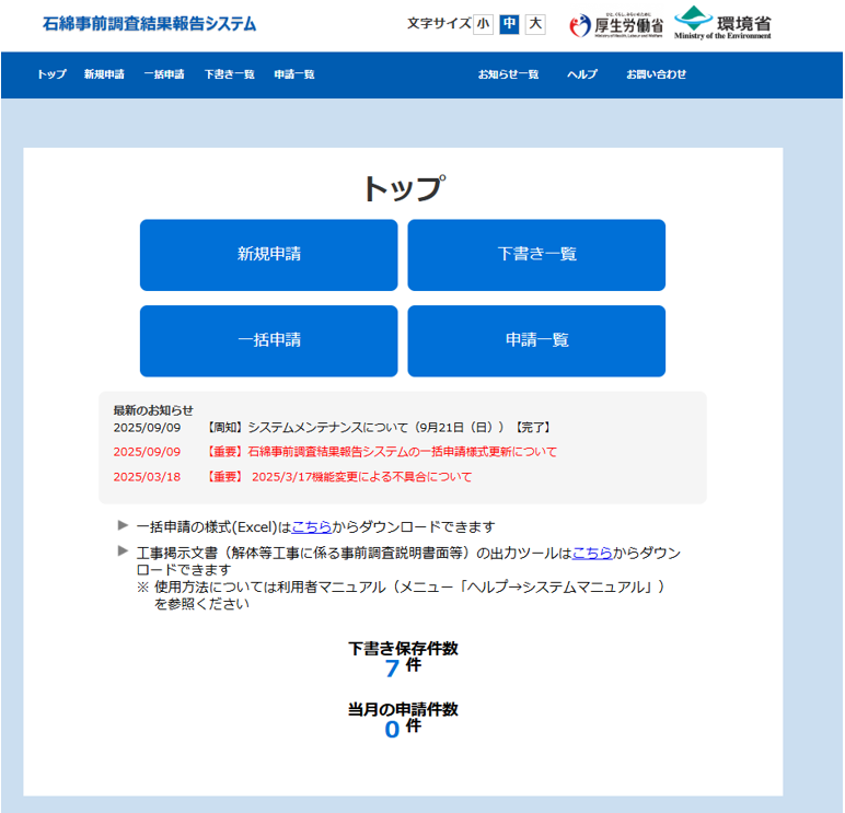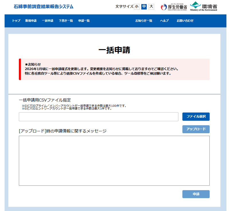 石綿事前調査結果報告システム(Gビズ)に申請データをアップロードした際に、[アップロードされたファイル形式に誤りがあります。]が発生した場合は、再度CSVダウンロードを行い、データを開かずにアップロードしてください。