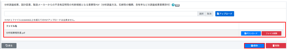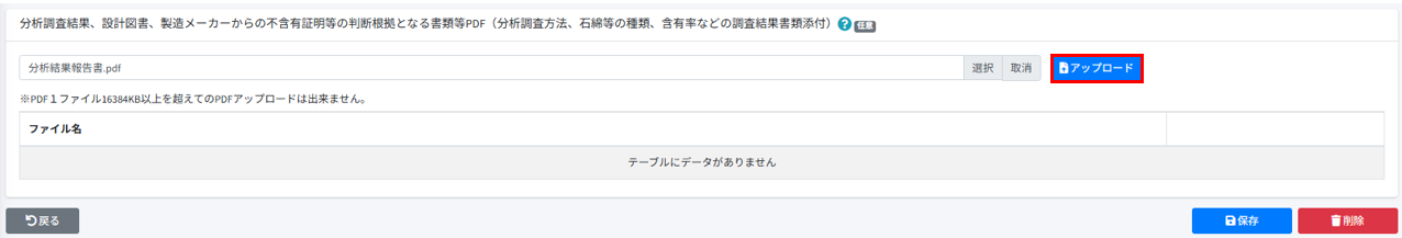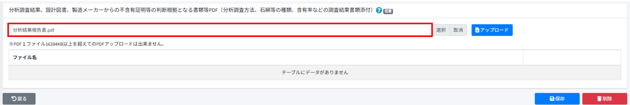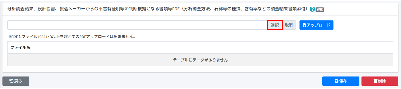 [事前調査結果記録]の[分析調査結果、設計図書、製造メーカーからの不含有証明等の判断根拠となる書類等PDF(分析調査方法、石綿等の種類、含有率などの調査結果書類添付)]の[選択]押します。