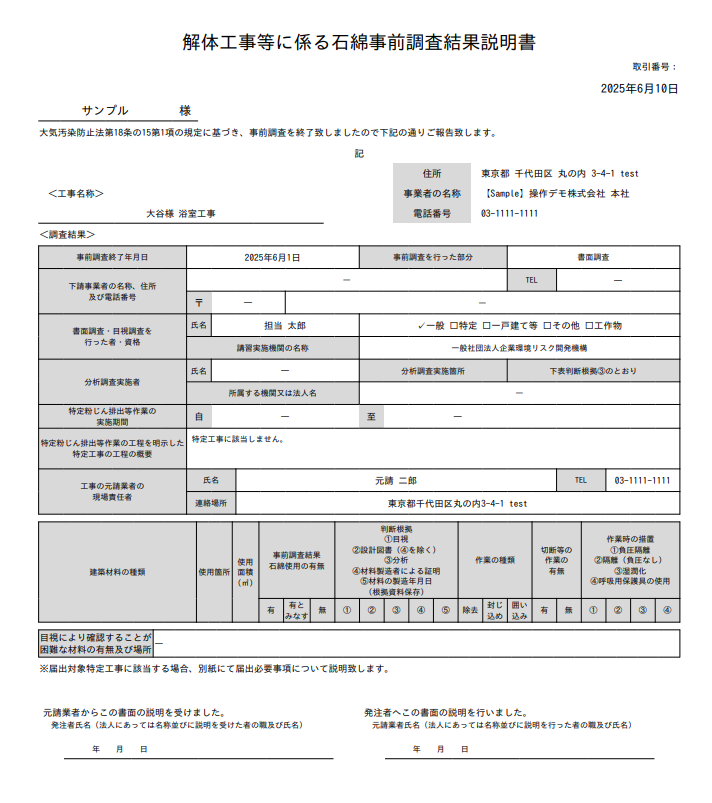 事前調査結果の説明に係る署名は、法令上必須ではなく、あくまでアスベストONEの仕様となります。ただし、元請業者は解体等工事の発注者に対し、書面を交付して説明する義務があり、記録は3年間保管する必要があります。
