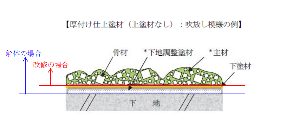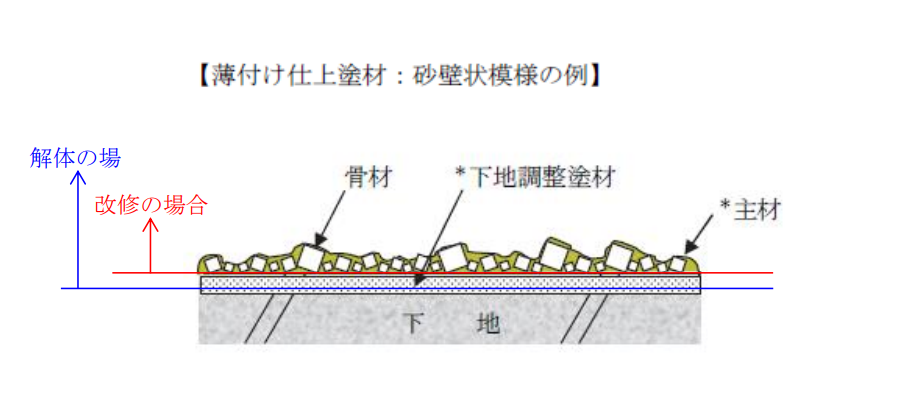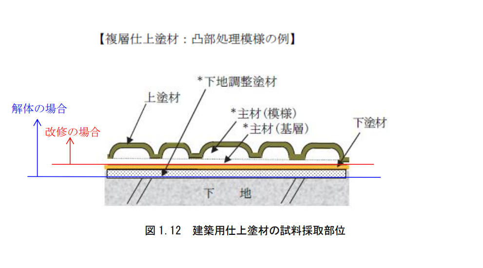 (2)複層仕上塗材(吹付けタイル仕上げなど)は、上塗材・主材・下塗材があるが、上塗材の厚さは塗料と同じ数十ミクロンであり、下塗材もほとんど層を構成していない。したがって、複層仕上塗材層のほとんどが主材部分であり、これをカッ ターナイフ、スクレーパ、ノミ等削り取るのが一般的である。複層仕上塗材は表面に凹凸模様のテクスチャーが付与されていることが多い。これらの凹凸部分を 形成している主材は、どの部分であっても組成は均一である。また、複層仕上塗材は下地への付着強度が高いので、下地と主材層との界面からきれいに剥離除去できない場合が多いと考えられる。このような場合は、主材層を部分的に破壊して採取することとなる。