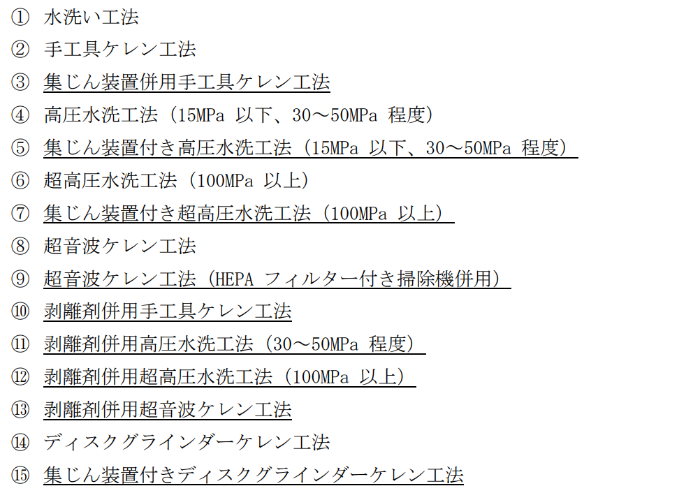 建築用仕上塗材の改修工事や除去工事では、仕上塗材の種類、仕上塗材層の劣化程度、仕上塗材層の処理の程度、仕上塗材層の除去効率、粉じんの発生程度、作業場の隔離養生の要否、廃水処理の要否、施工費等の諸条件を考慮して、①~⑮の処理工法中から適切なものが選定される。