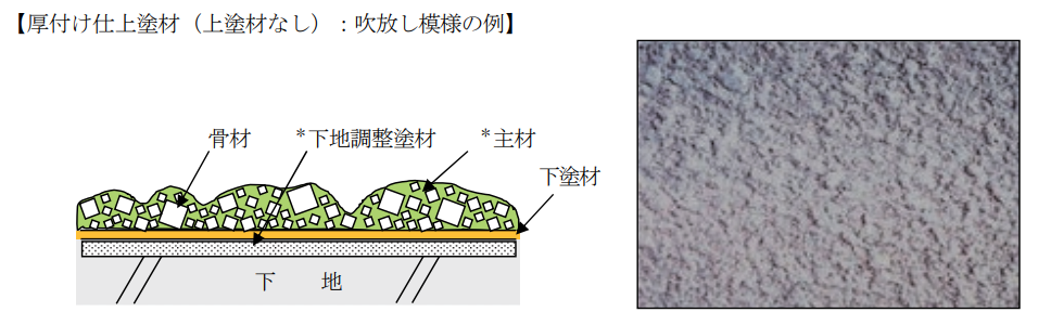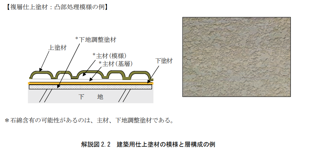 また、仕上塗材は薄付け仕上げ塗材、厚付け仕上げ塗材、複層仕上げ塗材に区別され、主材と下地調整材に石綿が含まれています。