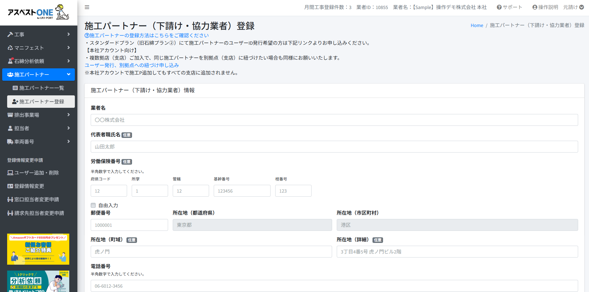 自社施工以外で石綿に関する工事を実施される場合は、あらかじめ施工パートナーの登録が必要です。登録作業は、元請業者様でご対応いただきます。施工パートナー登録は何社でも無料でご利用いただけます。