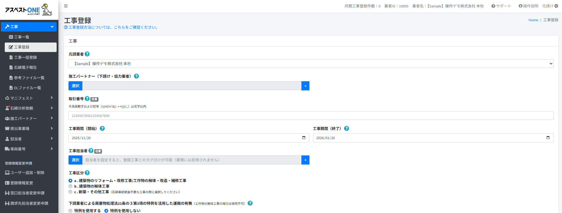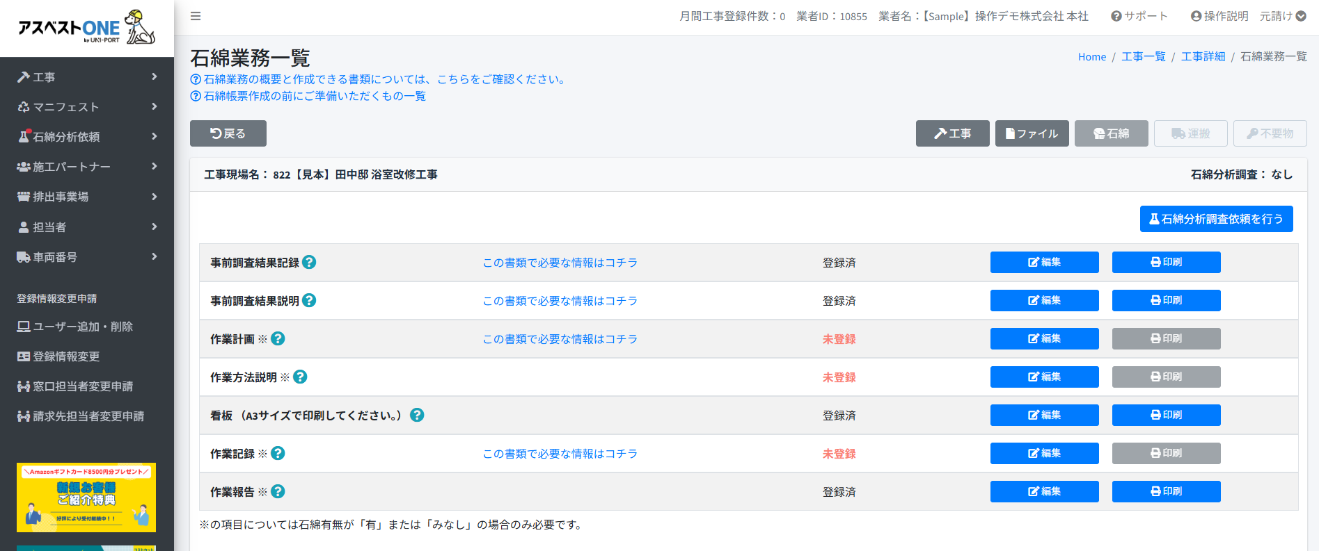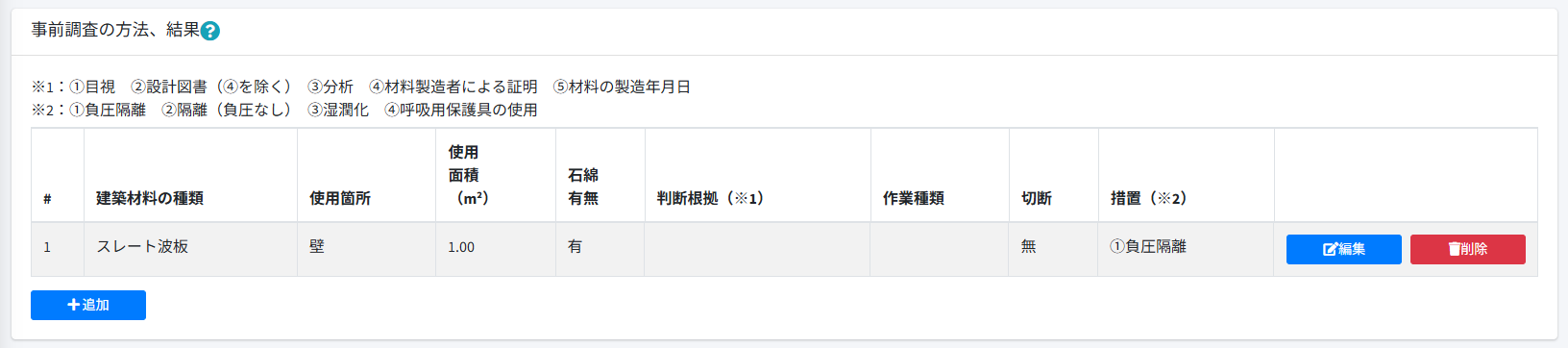 [事前調査の方法、結果]で[石綿有無]が[有]の場合は、[特定粉じん排出等作業]の登録が可能です。