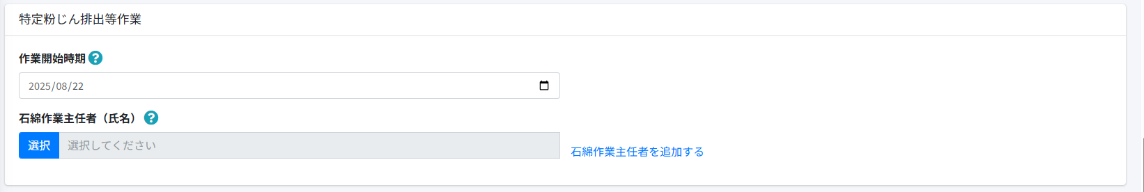 [特定粉じん排出等作業]の[石綿作業主任者(氏名)]で[石綿作業主任者を追加する]を選択します。