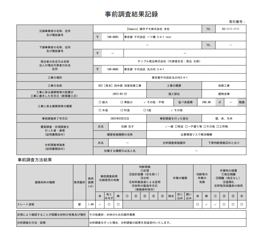 [事前調査結果記録]の「下請事業者の名称、住所及び電話番号」には、[工事登録]画面でメイン表示される「施工パートナー」の情報が反映されます。