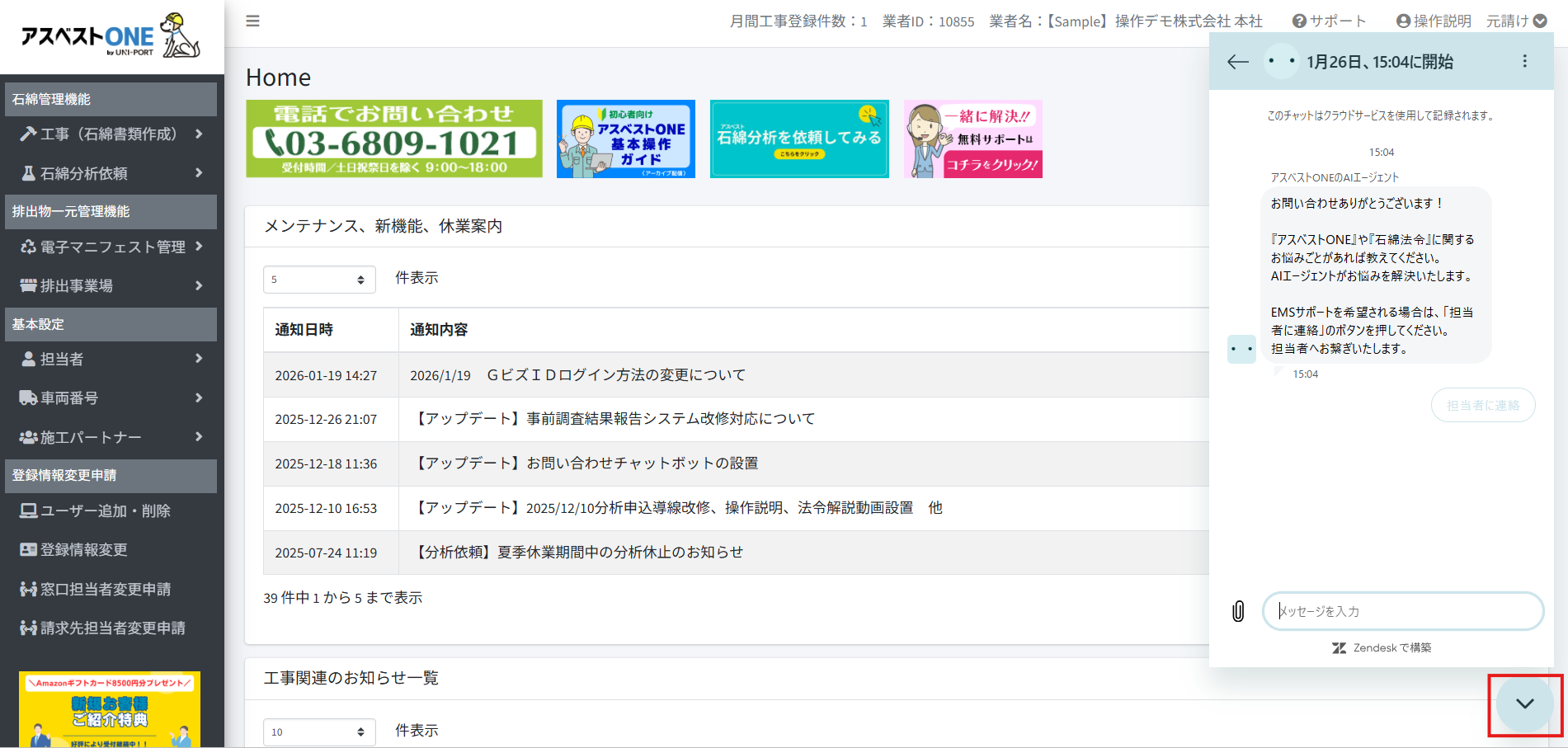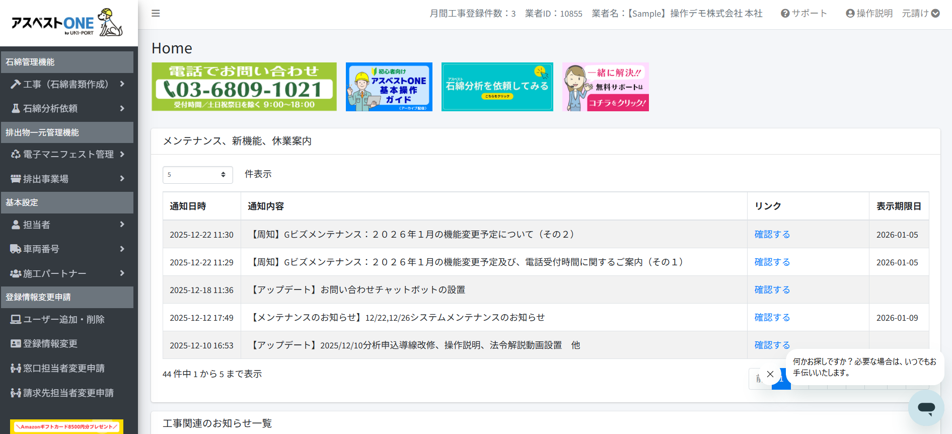 『アスベストONE』や『サポートページ』では、[チャットボット]をご用意しております。