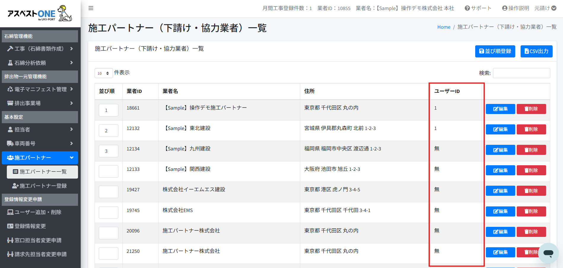 [施工パートナー一覧]で[ユーザーID]が[1]の場合は、施工パートナー参画機能(オプション)に該当します。5社までは無料でご利用いただけます。