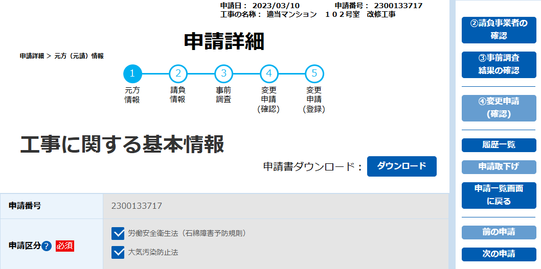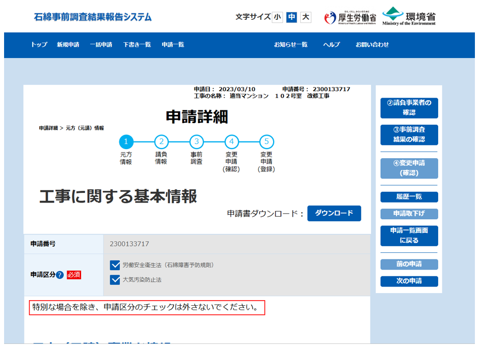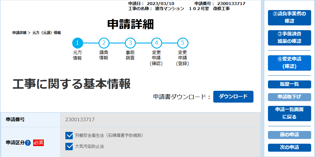 申請内容の修正は、石綿事前調査結果報告システム(Gビズ)もしくはアスベストONEより修正する必要がございます。
