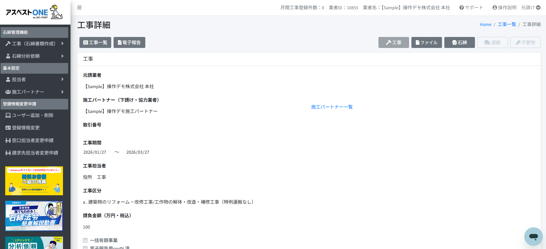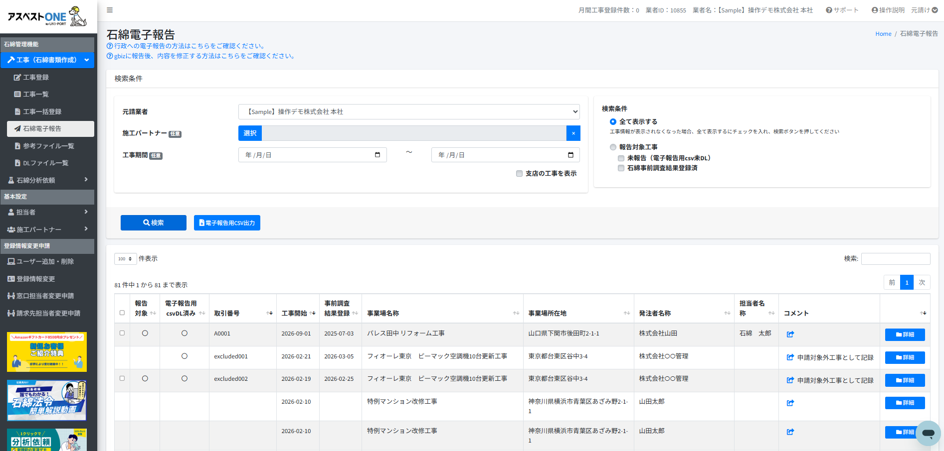 - [アスベストONE]にログインし、[工事一覧]から該当の工事の[詳細]へ進みます。