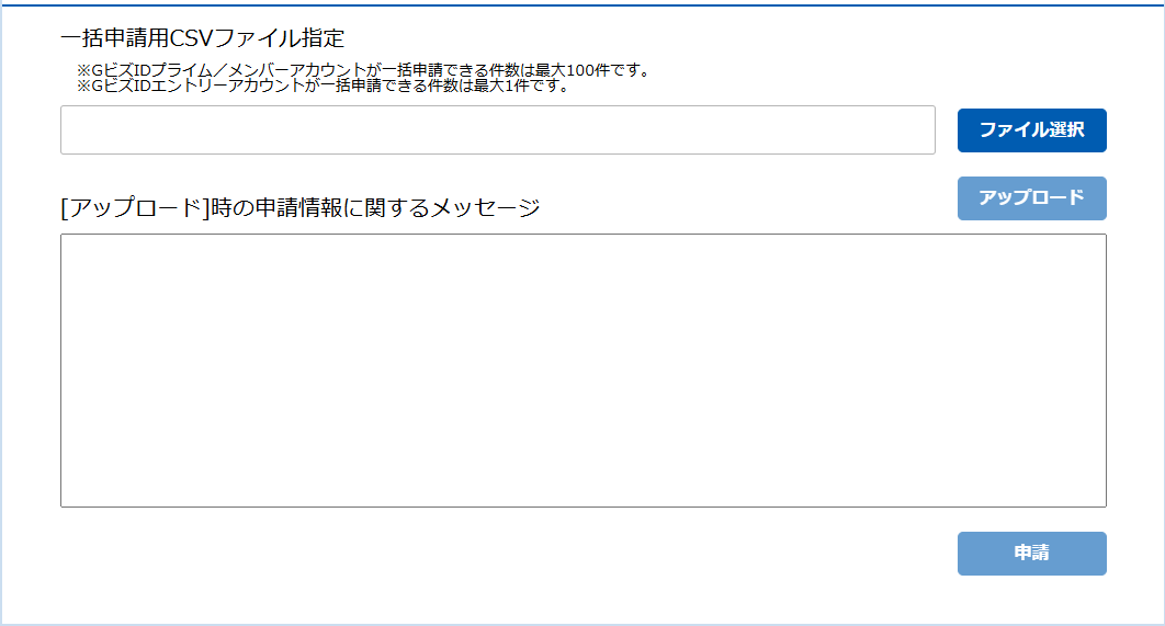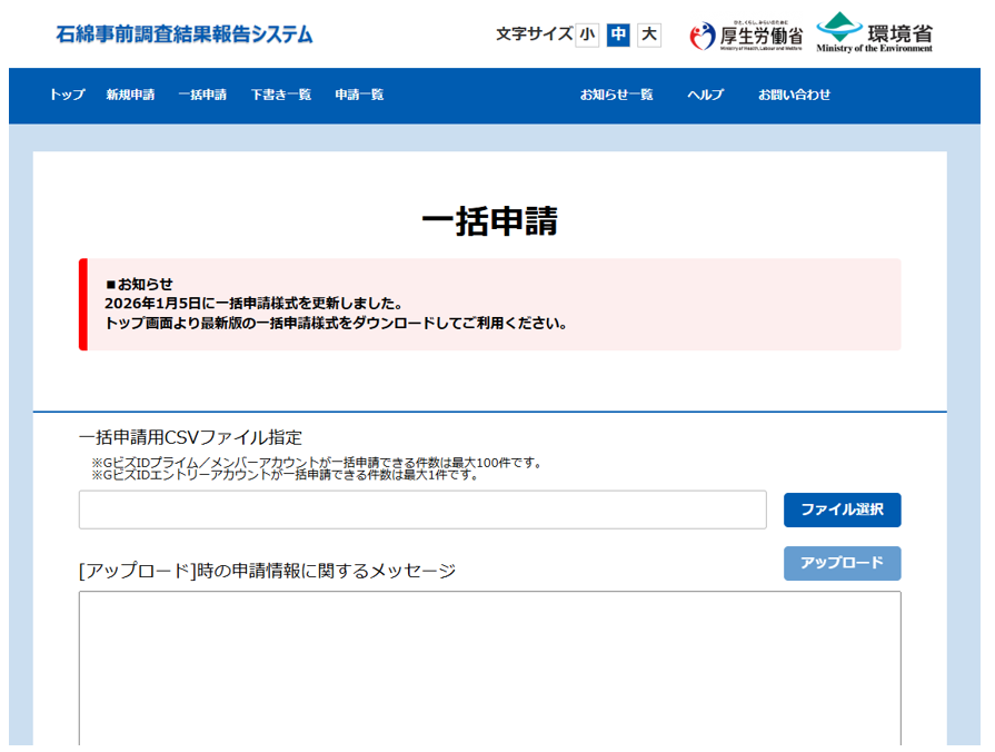 - 石綿事前調査結果報告システム(Gビズ)を開き[一括申請]より、[アスベストONE]でダウンロードしたデータをアップロードします。